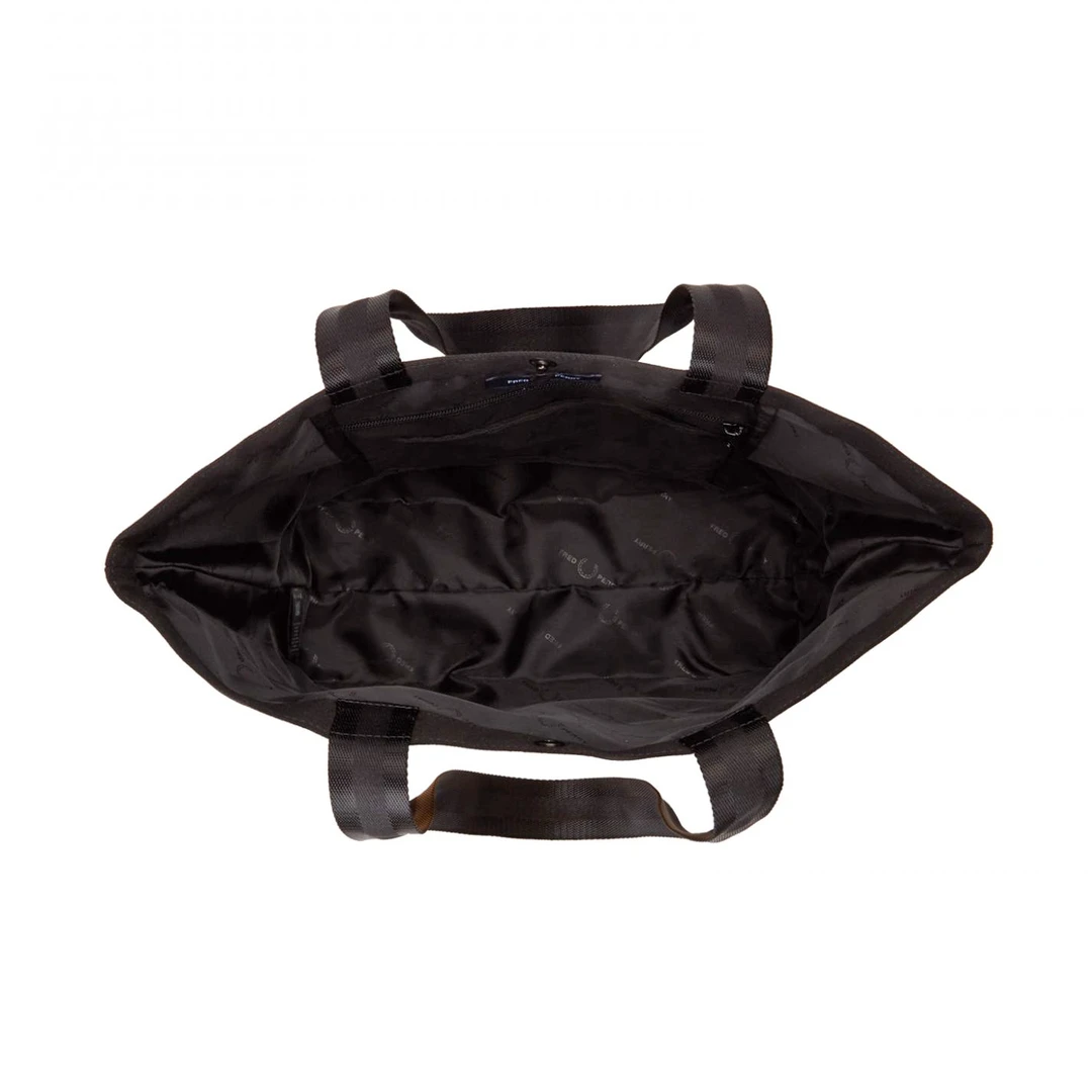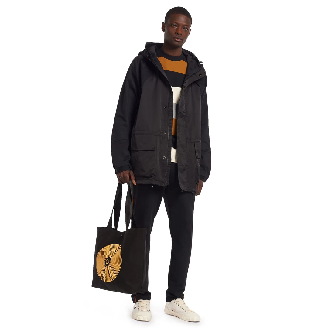 Perfect for record shopping, the Fred Perry disc graphic tote bag is the ideal size for your latest vinyl haul and features a spinning disc design on the front. Made of a durable cotton canvas with equally durable webbing straps and snaps close with a branded press stud. The interior features printed lining with an internal zip pocket.