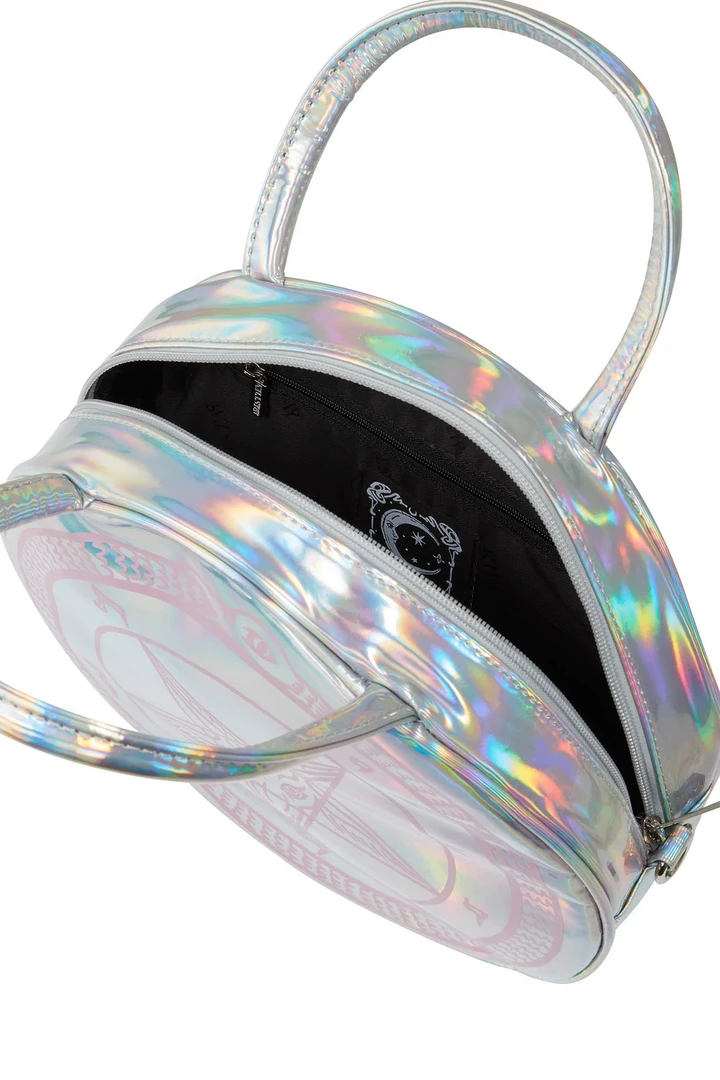Sweet and playful, with all the details on-point, the Baby Baphomet Handbag from Killstar is a serious must-have! Made of a superior grade faux leather in silver with a shiny rainbow holo finish, large pentagram with baphomet on front in pink, and an additional shoulder strap plus handles. The interior is fully lined and purse zips close to keep all your essentials safe.
