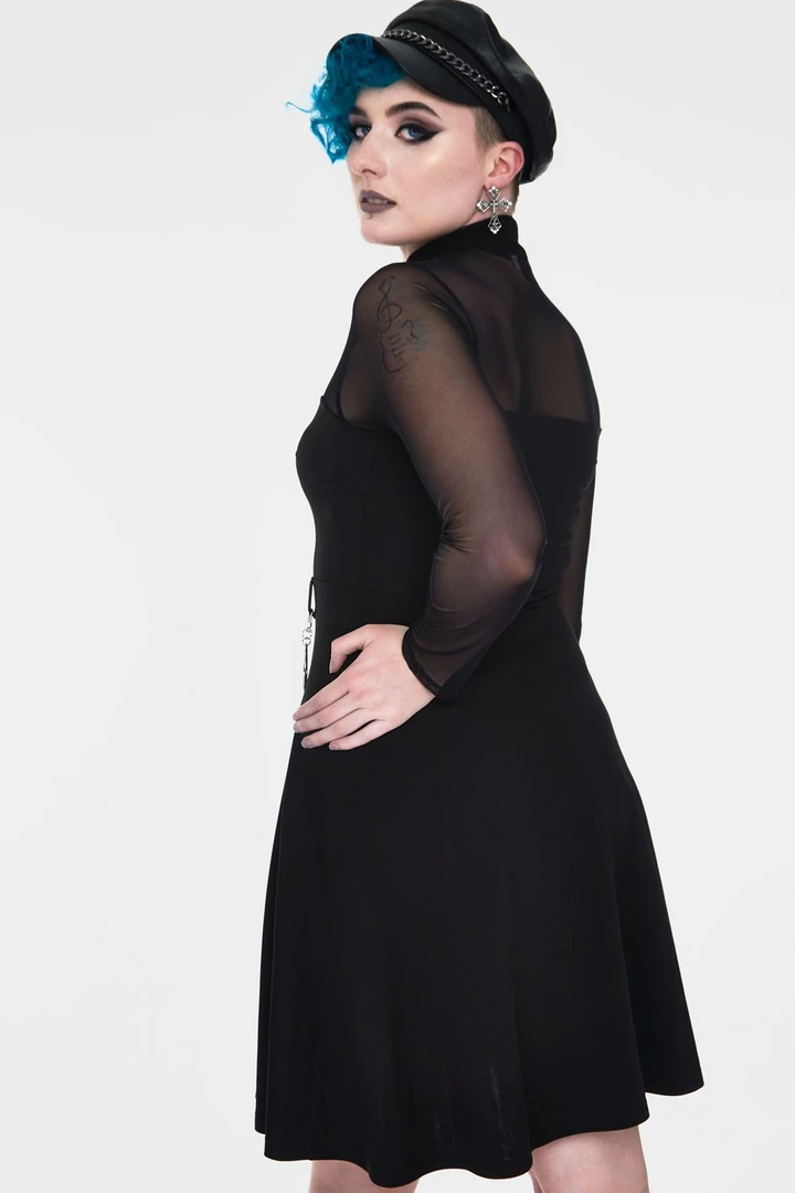 Turn heads in this little black dress from Jawbreaker! The Ring Choker Skater Dress features black mesh long sleeves, neck choker, and hardware metal rings on neck and front. A universally flattering fit and flare style, this dress falls to above the knee.