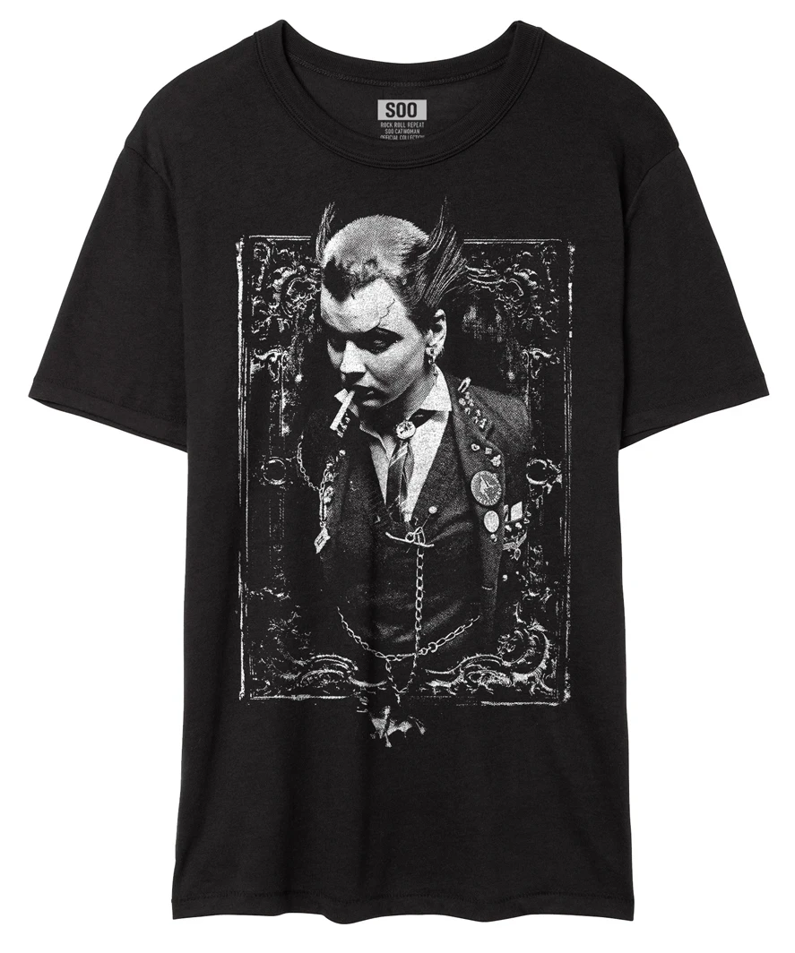 It’s Soo! These great RockRollRepeat tees feature a softhand print of Peter Marlow’s 1976 photo of the iconic Soo Catwoman at The Roxy Club on black, vintage jersey, sweatshop-free tees. Unisex fit, you may wish to size down for a more fitted look.