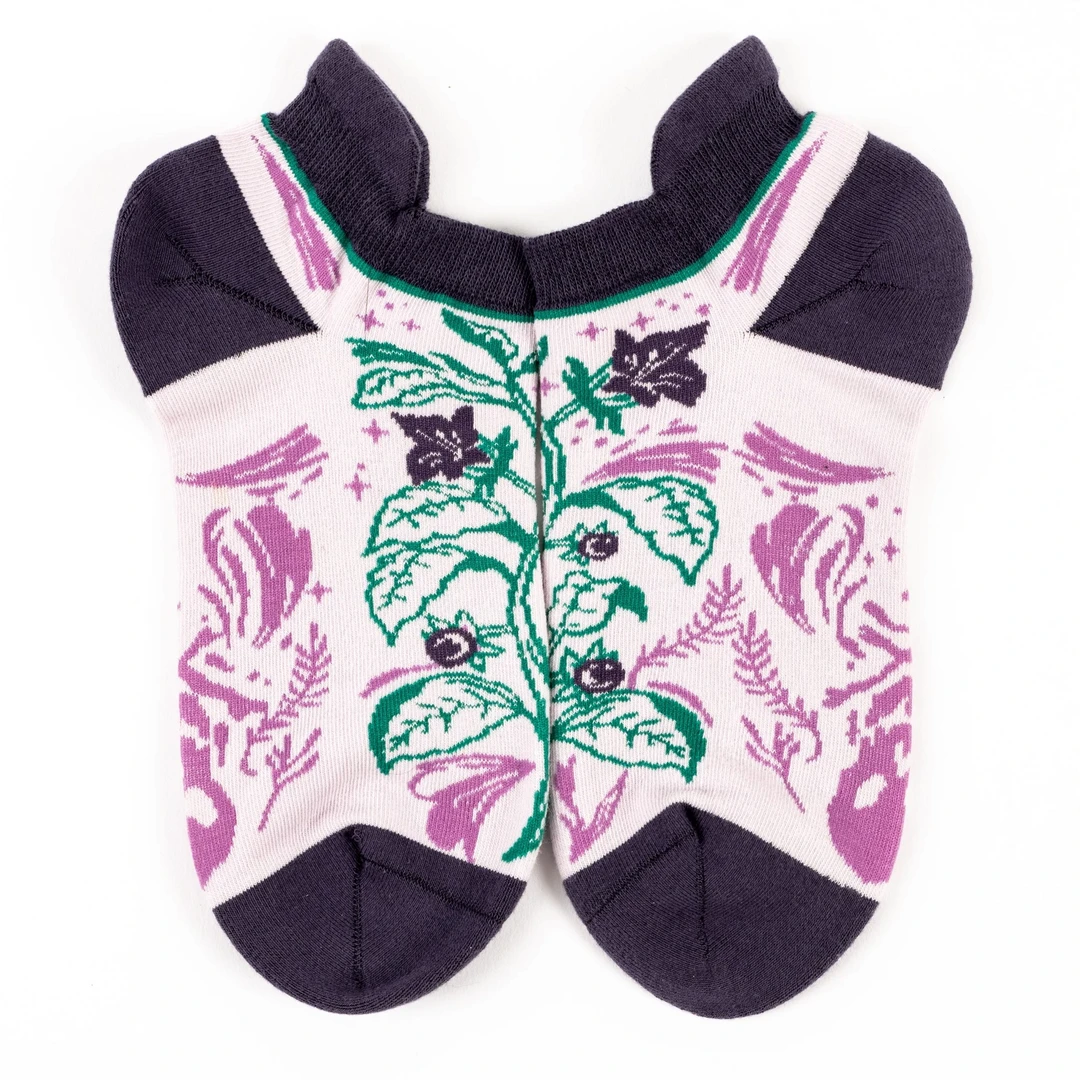 The name “belladonna” means “beautiful lady,” and was chosen because of a risky practice in Italy. The belladonna berry juice was used historically in Italy to enlarge the pupils of women, giving them a striking appearance. Poisonous plants that can kill you, but make it fashion. These Belladonna Deadly Nightshade ankle socks from FootClothes are super soft and cushy and awesome to boot! They feature reinforced toe and heel area for long lasting durability and comfort with a high thread count so they’re like fancy sheets, but for your feet!