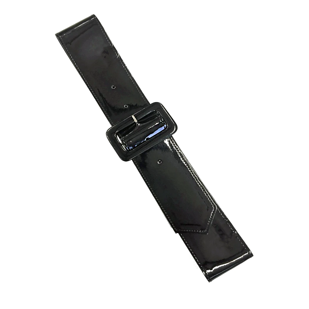 Add the perfect finishing touch to any pinup outfit with this faux patent leather belt from Hell Bunny! This curve creating solid black belt fastens with a large adjustable buckle, perforated with holes and finished with topstitching.