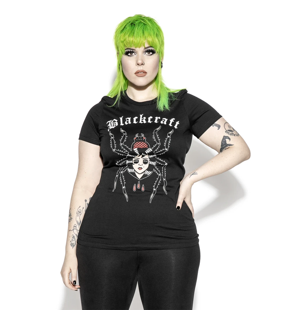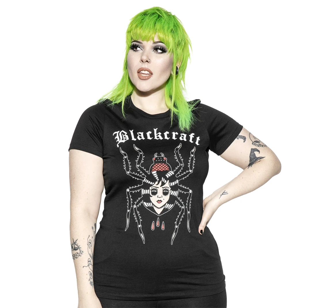 Beware – for a wicked web she weaves. This fitted ladies tee from Blackcraft Cult features their original tattoo inspired Ladycraft graphic on the front.