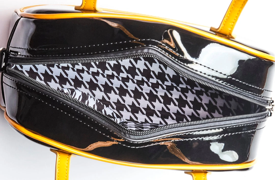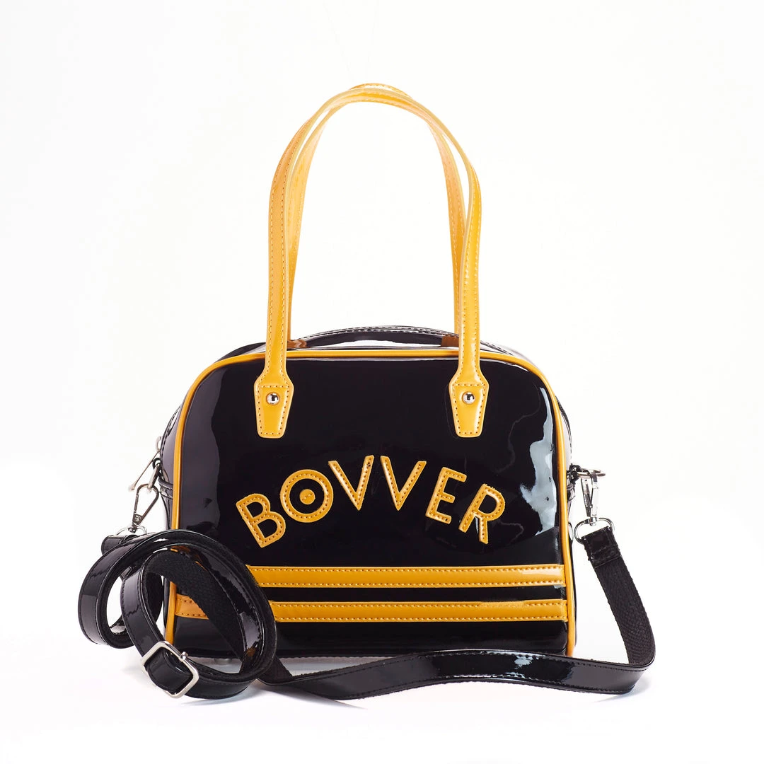 The Bovver gig bag is made of a high quality black vinyl gloss with yellow laser cut vinyl lettering and details. The handles are reinforced and finished with round silver studs. A detachable crossover strap makes it easy to carry when your hands are full or you’re busy dancing. A special note, the inside is lined with black and white houndstooth pattern complete with inside pockets.