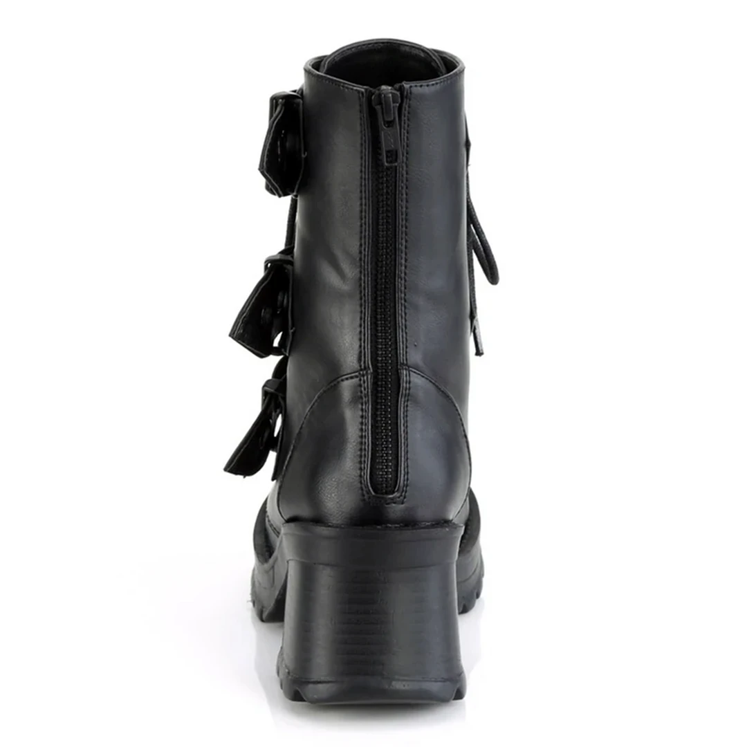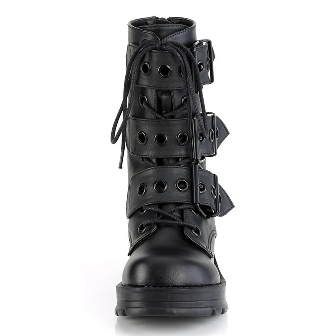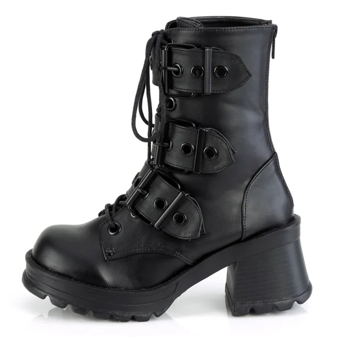 Put some attitude in every step in the Bratty Lace Up Ankle Boots from Demonia. These combat style boots feature a slight platform at the front, with a higher heel at the back, lace up styling, triple eyeleted buckle straps and a zip closure at the back for easy on and off. Looks killer with fishnets and your favorite black dress!