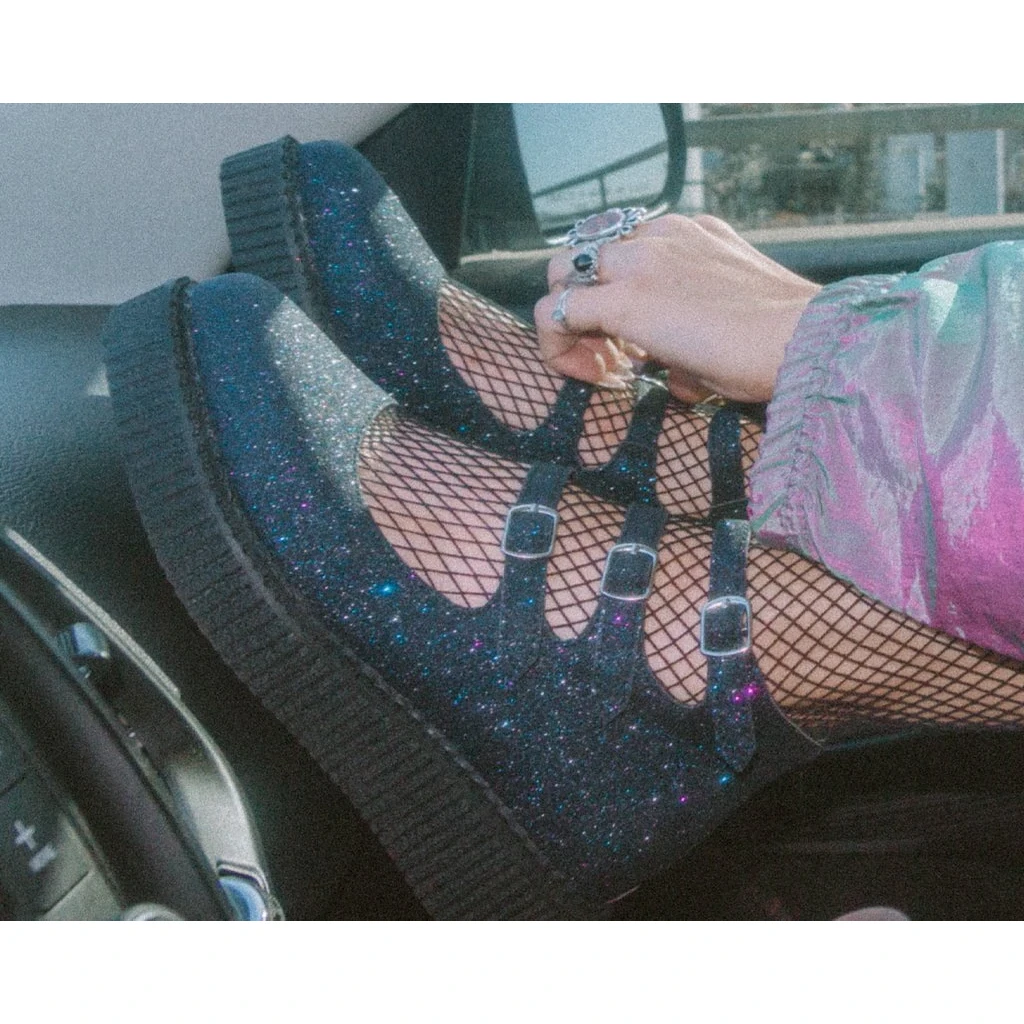 Put some sparkle in every step with these fun black glitter mary janes from T.U.K. Featuring a black glitter finish, pointed-shaped toe and multi-strap closure for an adjustable fit. Sits on top of a low sole creeper platform that measures 1.25” at the heel and .75” in the front. Has a back zipper for easy on/off wear and removable memory foam padding for added comfort.