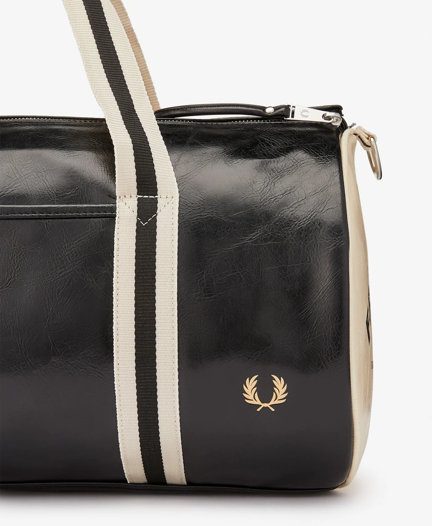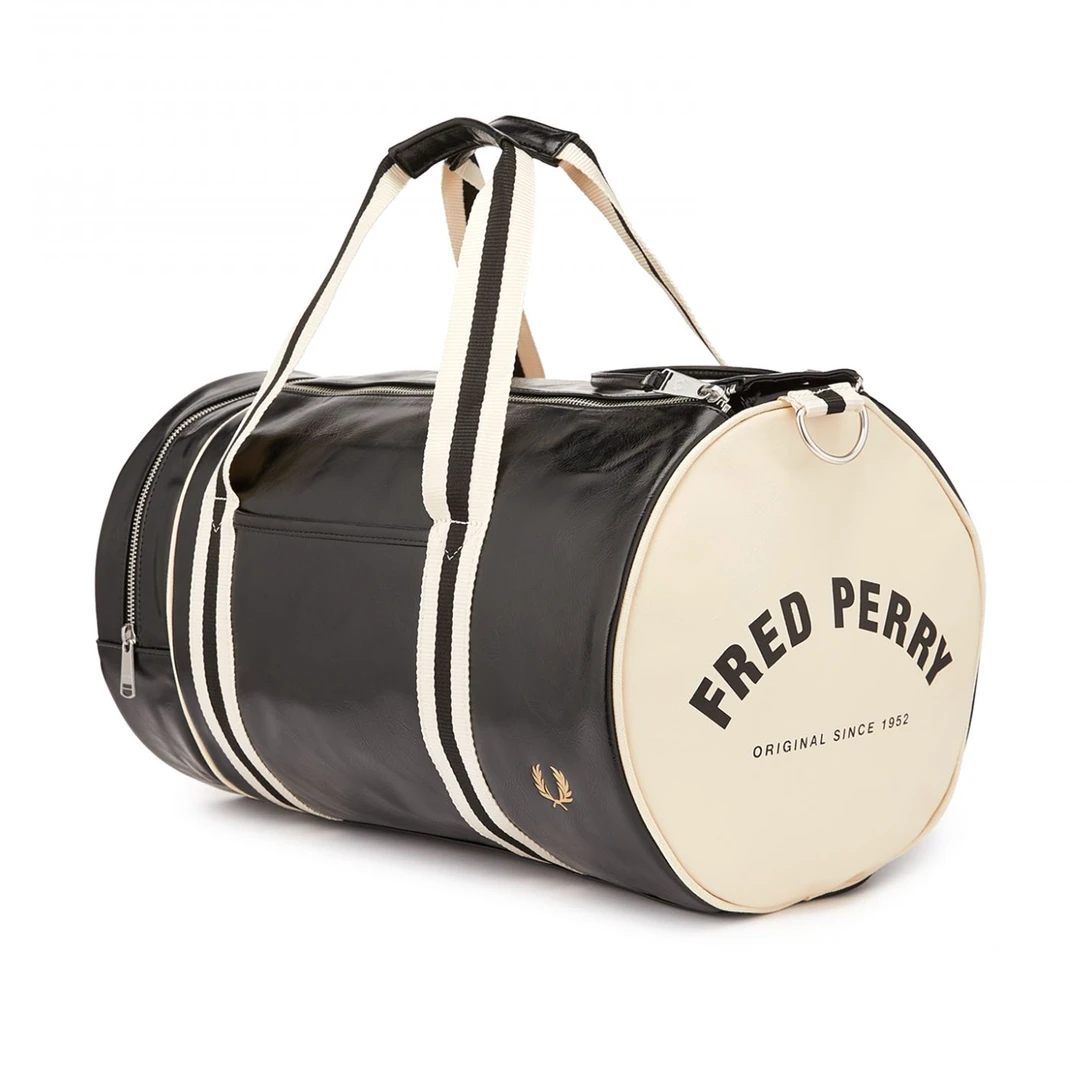 Used by sportsmen and women for decades, the classic Fred Perry Barrel Bag remains unchanged. Crafted from a tough PU in classic black with ecru accents, this bag features strong webbing handles, debossed branding, silver-tone hardware, double-zip closure and a zipped compartment at one end. The interior has an additional zip pocket and zip compartment. Functional, durable and unmistakably Fred Perry.