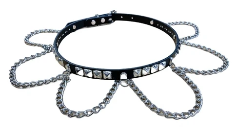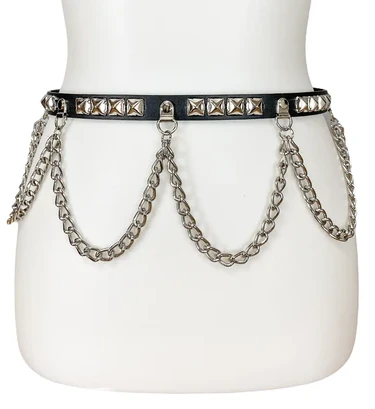 Amp up any look with this belt complete with silver pyramid studs and looped chain accents. It’s approx. .75″ wide with 1/2″ pyramid studs and looks great over form fitting dresses or over your favorite black denim.