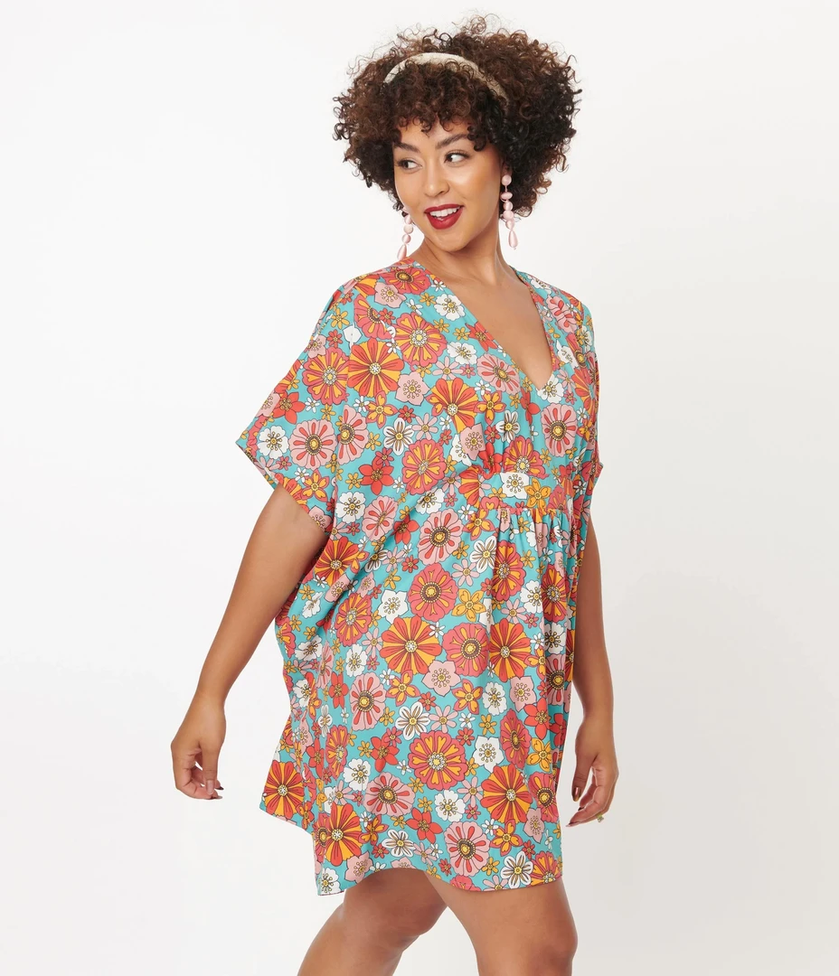 This sweet caftan dress from Smak Parlour is crafted in a dreamy, lightweight fabric that dances with a retro coral, pink, orange, and white floral pattern on a cheery turquoise backdrop. The sultry V-neckline is framed by sweeping half sleeves and is nipped in the waist with self ties for a marvelous fit. Complete with a flirtatious hemline that drops above the knees. So easy to wear and perfect for warm summer days!