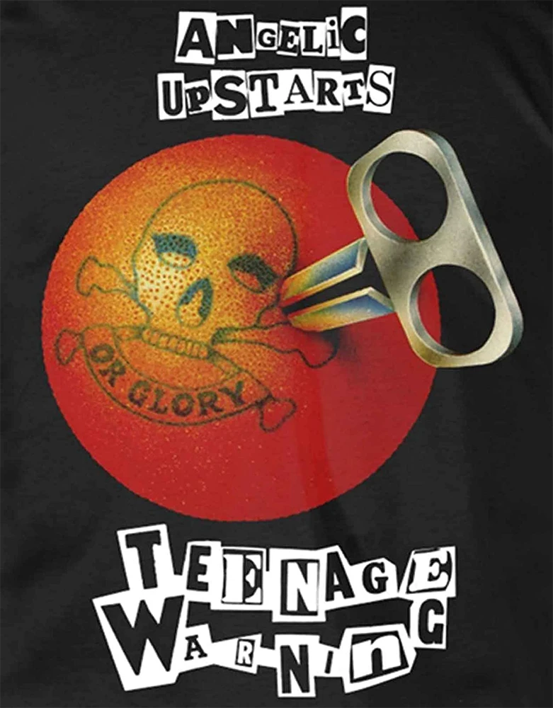 Officially licesned Angelic Upstarts Teenage Warning t-shirt, printed on a soft, 100% cotton black t-shirt. Unisex/men’s fit.
