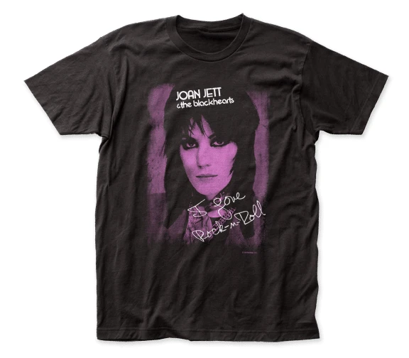 Put another dime in the jukebox, baby! This officially licensed Joan Jett t-shirt features an image of her in purple with I Love Rock N Roll scrawled across. Printed on a soft, black, 100% cotton unisex fit tee.
