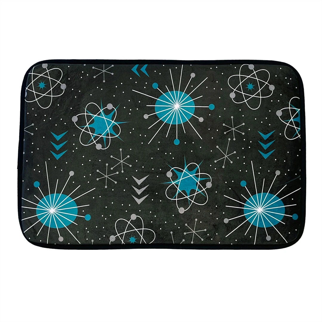 Achieve retro perfection in your home thanks to our Atomica Bath Mat! Designed in house, this soft, slightly cushioned mat features printed graphics of vintage-inspired atomic designs in teal, gray, and white and will safely stay right in place, thanks to an anti-slip backing.