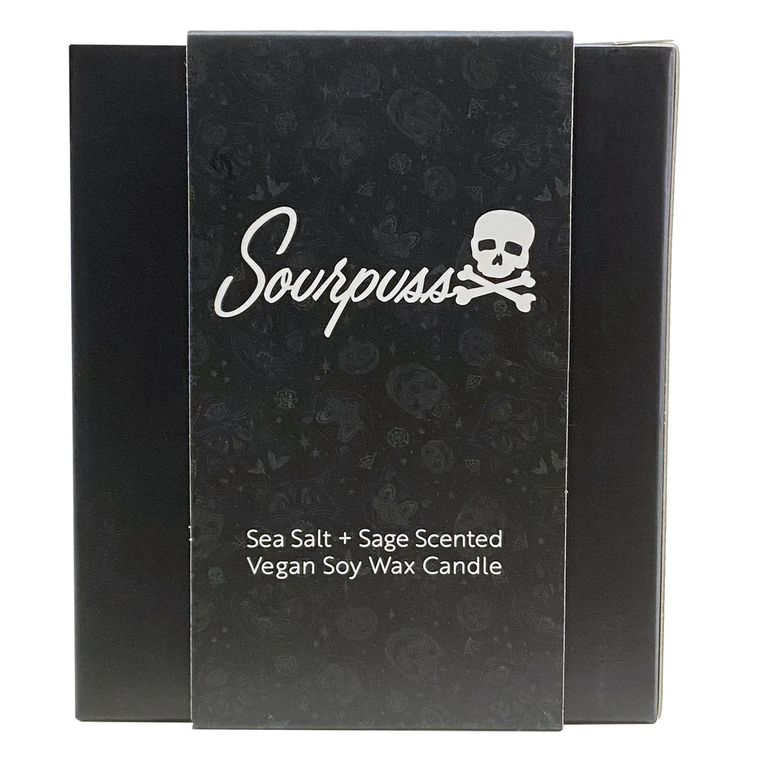 Check out the new vegan soy candles! This black glass candle has black soy wax and a black wick. We printed our classic pumpkin design and added a sea salt and sage scent. Comes in a gift box.