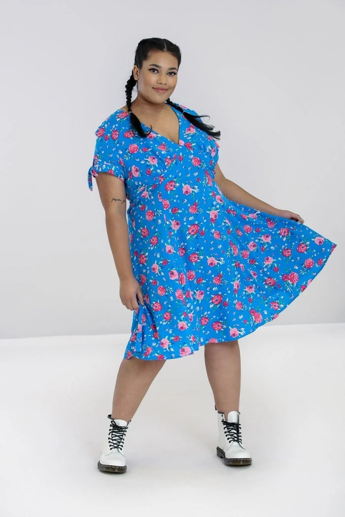 Florals your thing? Opt for this gorgeous Chantilly Mid Dress from Hell Bunny! This vibrant blue a-line dress is decorated with pretty pink flowers throughout and features cute, short sleeves with adjustable ties for your comfort. The modest v-neck leads to a cinched waist that has an adjustable matching tie. Zips up back to fasten.
