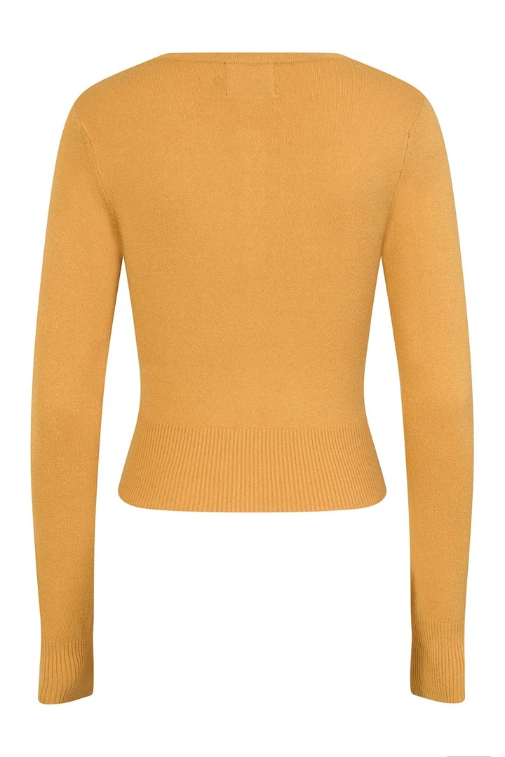 Top off your retro look with the perfect little cardigan from Hell Bunny! The Paloma Cardigan in mustard features ribbed cuffs and hem, and a row of clear glass effect buttons down the front in rmustard to match. Perfect for dresses and skirts, this cardigan hits right at the waistline.