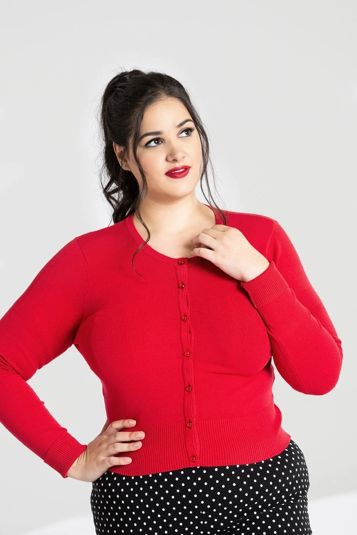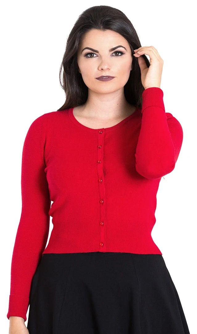 Top off your retro look with the perfect little cardigan from Hell Bunny! The Paloma Cardigan in red features ribbed cuffs and hem, and a row of clear glass effect buttons down the front in red to match. Perfect for dresses and skirts, this cardigan hits right at the waistline.