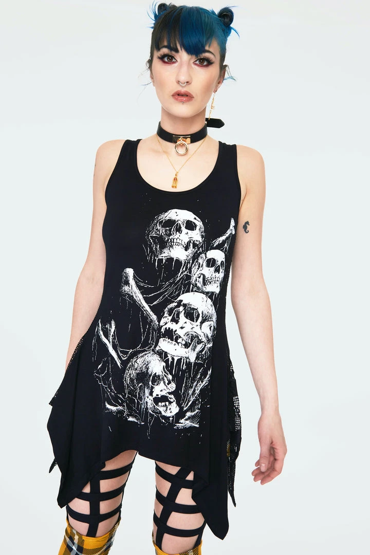 Get lost in the graveyard in this mesh-back tank top from Jawbreaker. With a sheer skull patterned mesh back and handkerchief hem, this unique top looks great with leggings for an easy outfit option!
