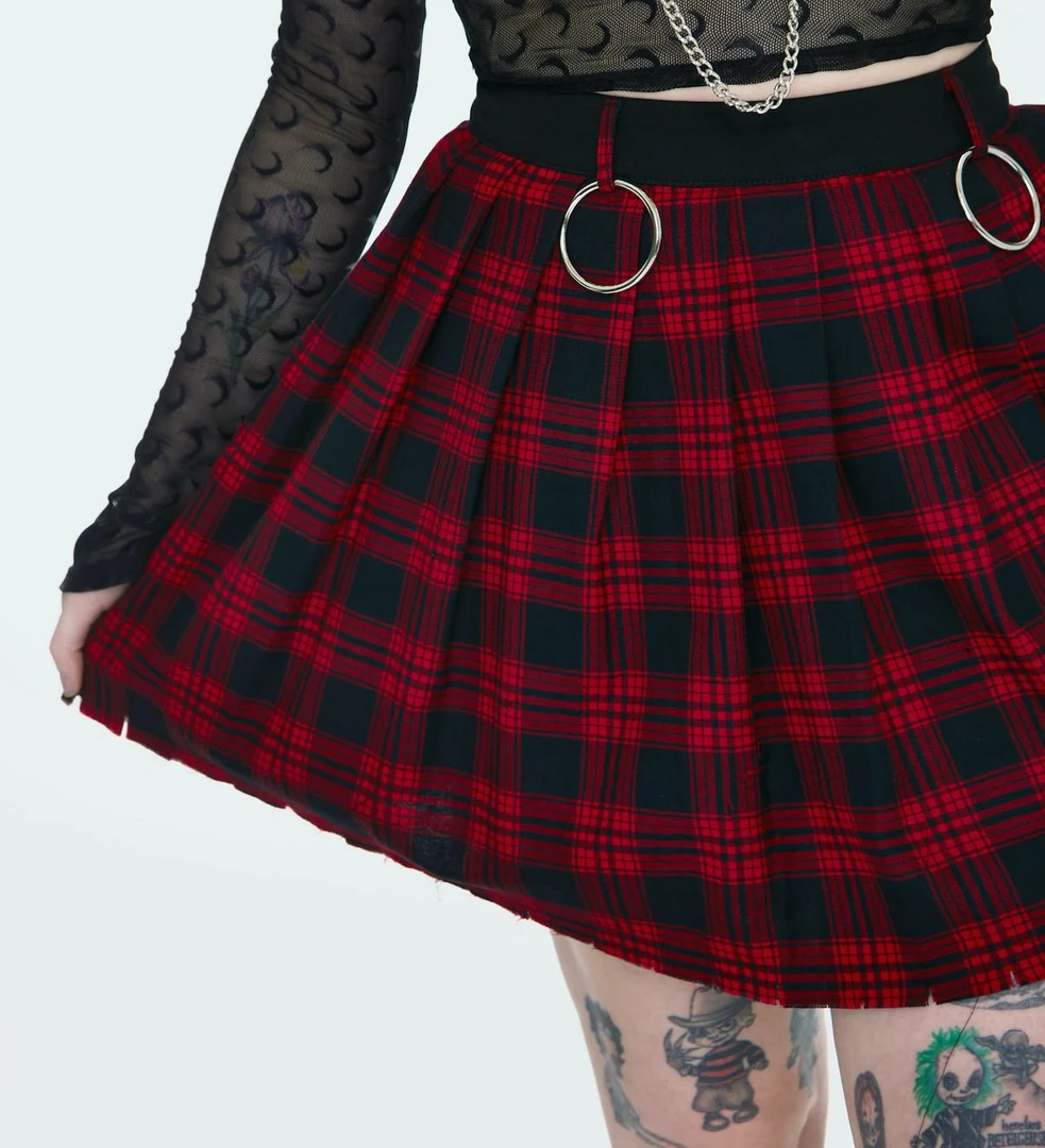 Grab some serious 90s vibes in the Teen Spirit Plaid Skirt from Jawbreaker! Crafted of a red and black plaid, this pleated mini skirt has O-ring hardware details, a raw edge hem, functional belt loops, and exposed zipper at the back. Looks great with all your favorite graphic tees!