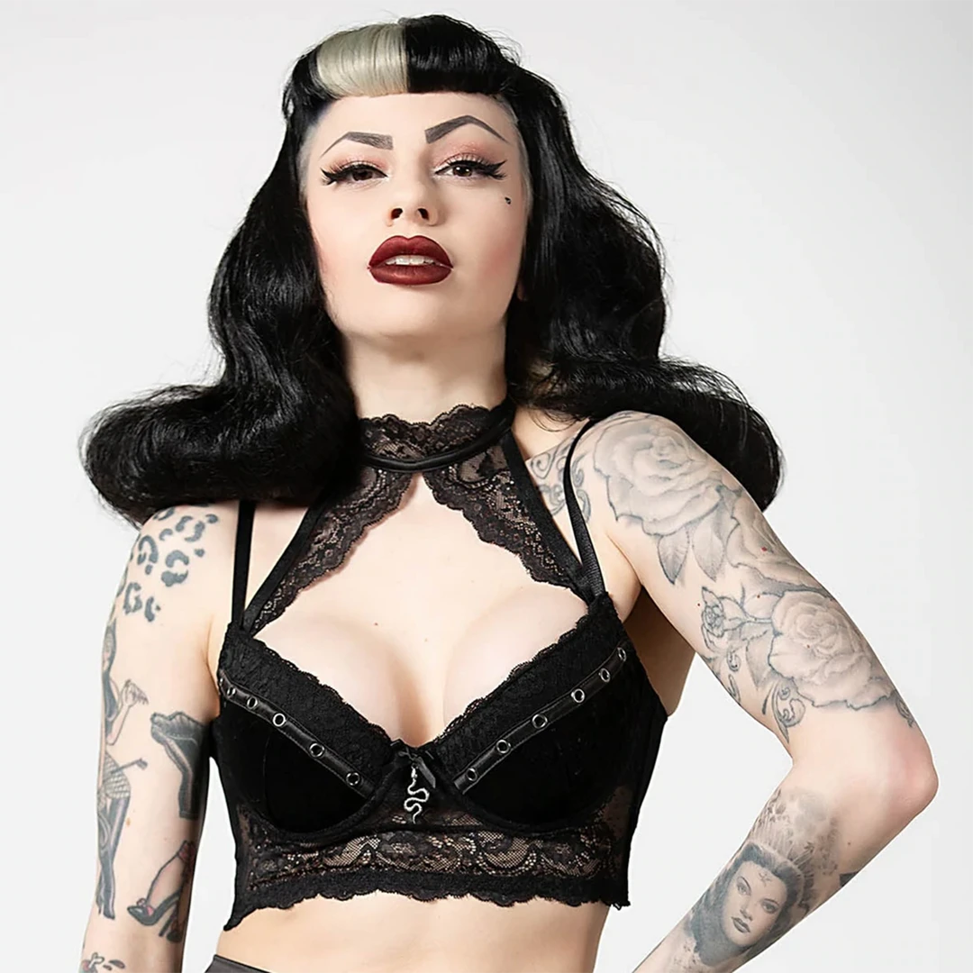 Make them beg for your attention in the Mercy Bra from Killstar. Crafted in soft luxe velvet with lightly padded cups and adjustable, elastic straps for the perfect fit. It’s complete with metal rivet details, snake charm at the center and a gorgeous lace choker collar. Be sure to match with the coordinating Mercy Panty and Garter Belt to complete the look!