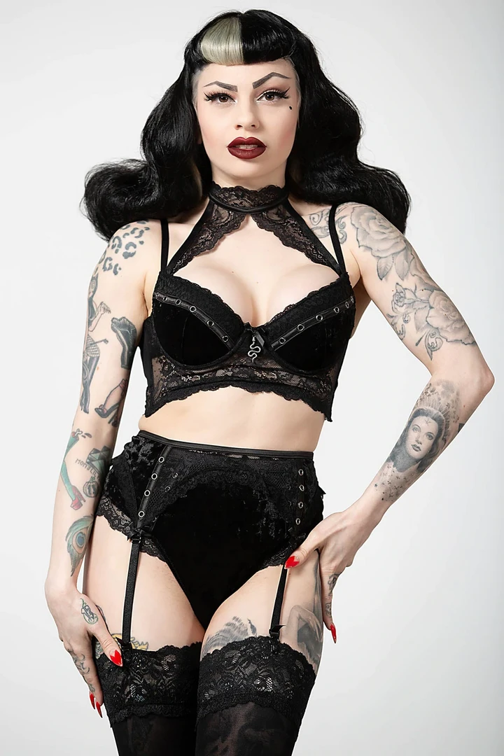 Make them beg for your attention in the Mercy lace garter belt from Killstar. Crafted in soft stretch, luxe black velvet, it has lace trim and metal rivet details, complete with adjustable suspender straps. Closes at the back with hook and eye closure. Match with the coordinating Mercy Bra and Panty to complete the look!