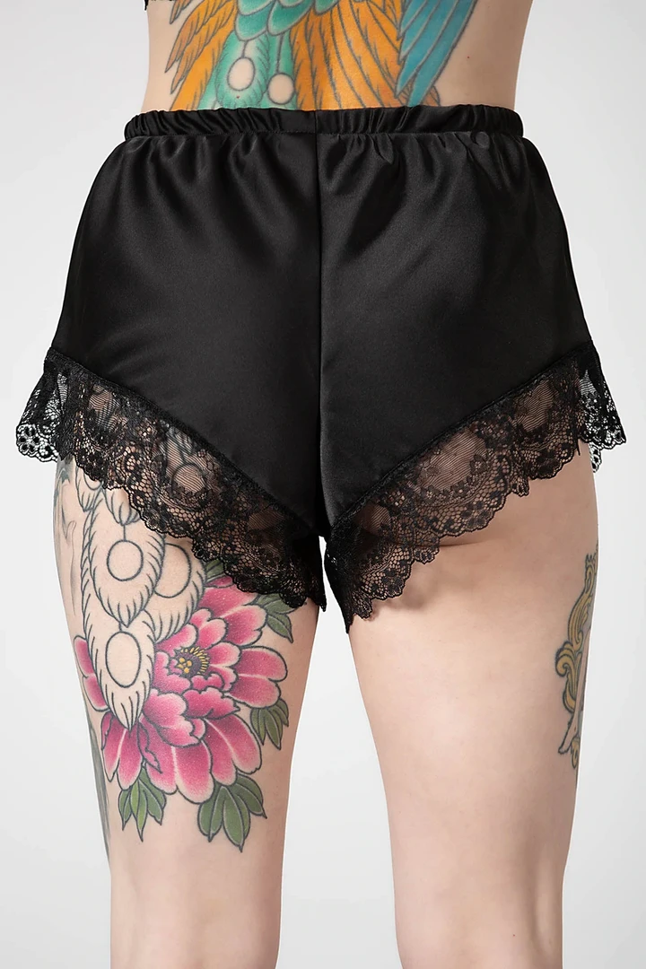 Spoil yourself with these luxe Severina Satin Shorts from Killstar. Made of a super soft satin material, these shorts are finished with a delicate lace trim and elasticated waist to create the perfect fit. Great for lounging around during the day or pair with your favorite bralet or cami for cute pjs!