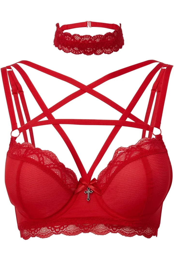 Which sin did you commit today? Fall in lust with the She Bites lace bra from Killstar and awaken yer inner temptress. Crafted using a super-soft scarlet hued lace for a sultry and flawless fit. No detail has been missed, with pentagram straps on the front, a high neckline, intricate lace trims, and a hook-and-eye fastening on the back. A bewitching statement piece – bound to make even the dark lord take notice. Match with the coordinating She Bites lace panty for a completely sinful look.
