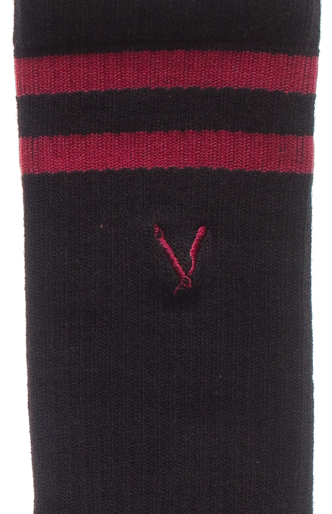 Look sharp, right down to your socks! Made of the highest quality and cushy heel, Our black, athletic-style crew socks feature oxblood stripes and switchblade embroidery, for a comfortable, yet dangerous, style.