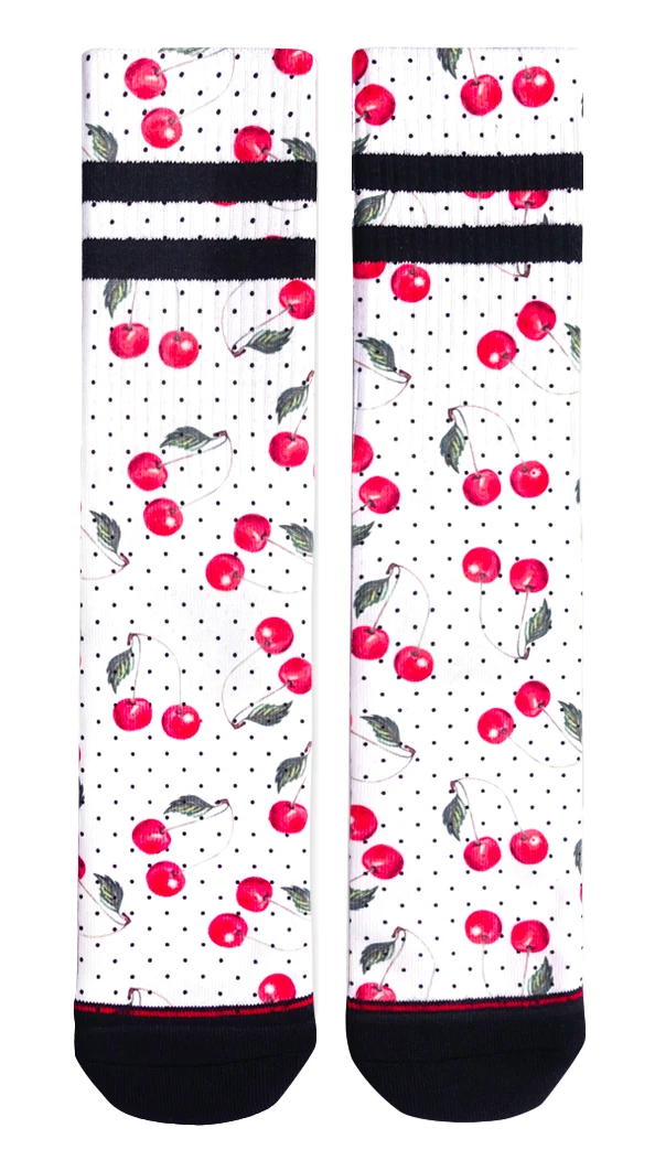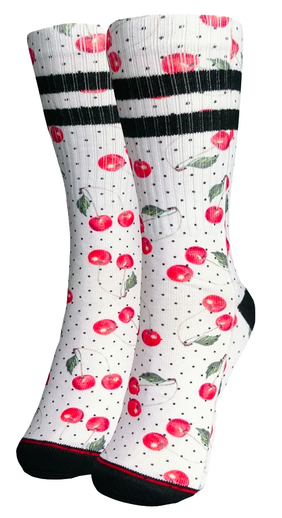 Slice of cherry pie, comin’ right up! Made of a soft quick dry material, these crew socks have an all over print of sweet cherries and polka dots and classic gym sock stripe styling.