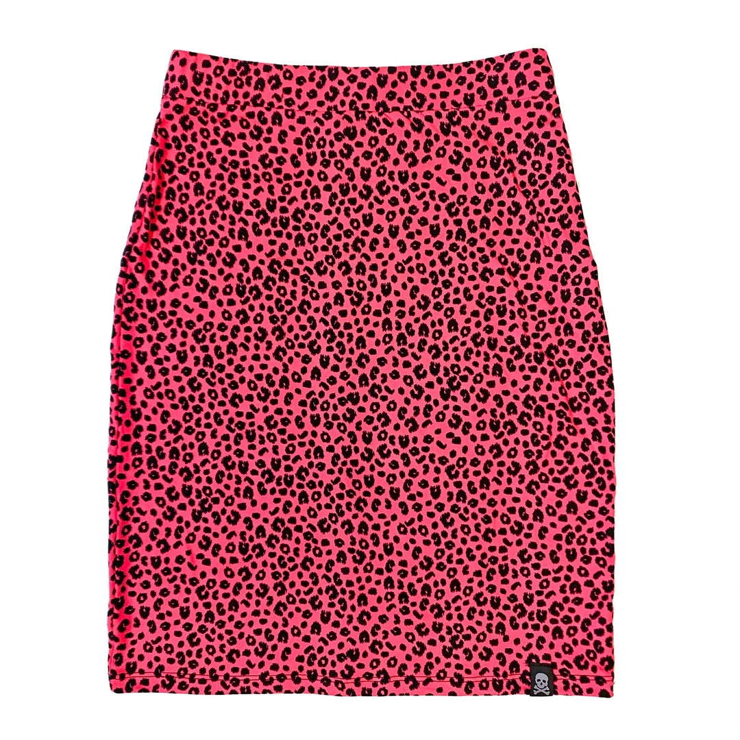 The new Midi skirts from Sourpuss are just what you need to amp up your wardrobe while staying as comfy as possible! This neon pink leopard ultra stretchy, soft brushed knit is figure flattering and cozy at the same time. It has an elastic waist, an above the knee length, and our signature Sourpuss flag label sewn onto the hem.