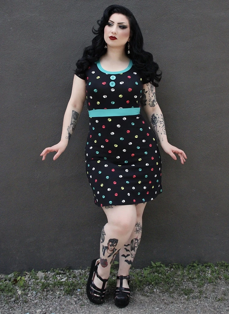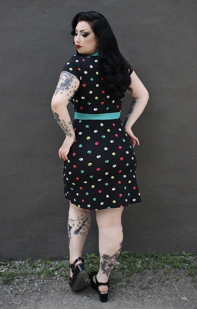 Our popular Beki dress is back! The new Multi Skulls Beki dress has a Sourpuss twist on the classic polka dot – multicolored skulls! This stretchy wiggle-style dress is comprised of a cotton/spandex knit, has a contrasting scoop neckline, and adorable oversized decorative buttons! It also matches perfectly with our Multi Skulls mask!