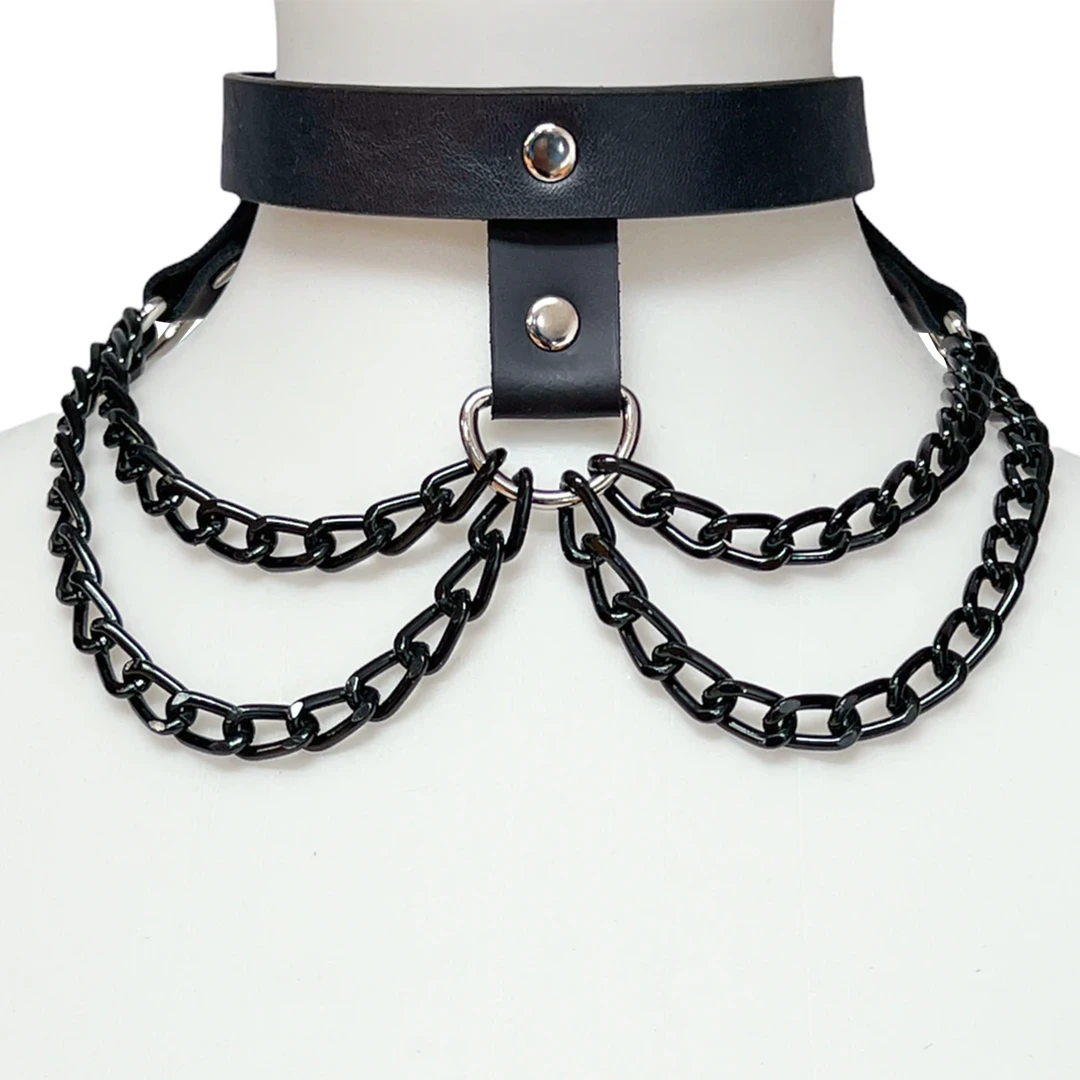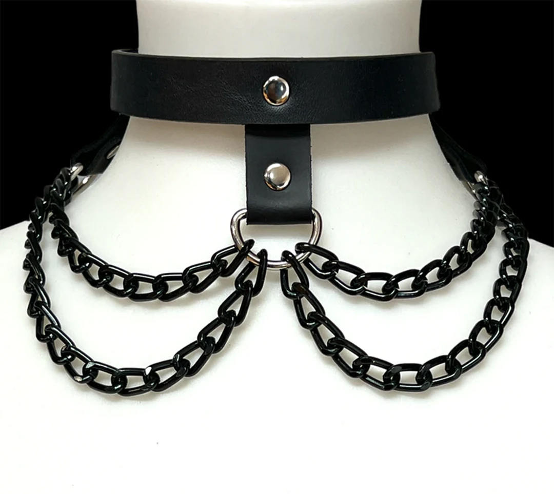 Hang with the best of ’em in this Hanging Chain 3 Strap Choker. Made of genuine leather, it features double rows of black chains. Looks great paired with a black dress!