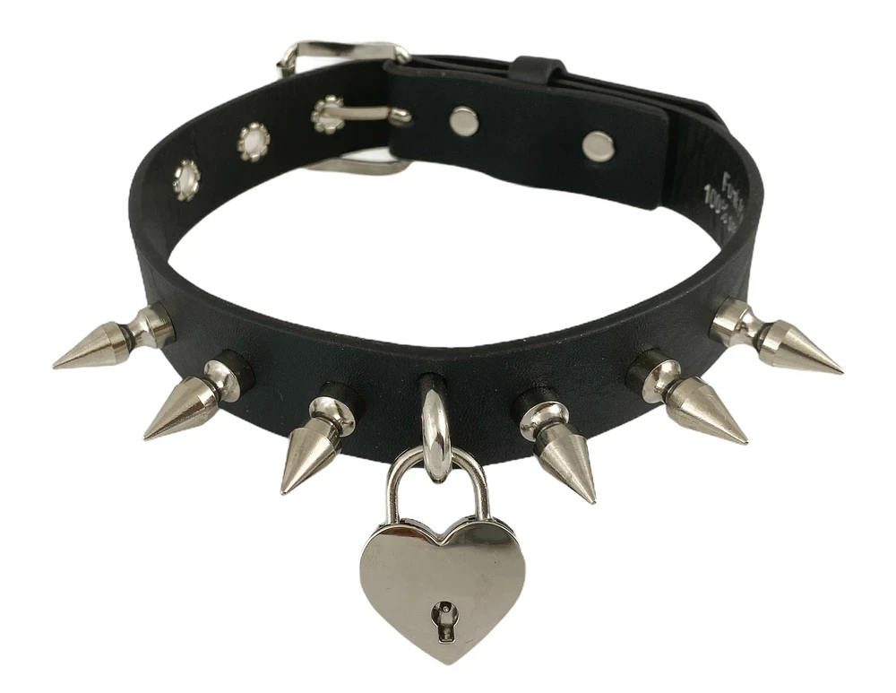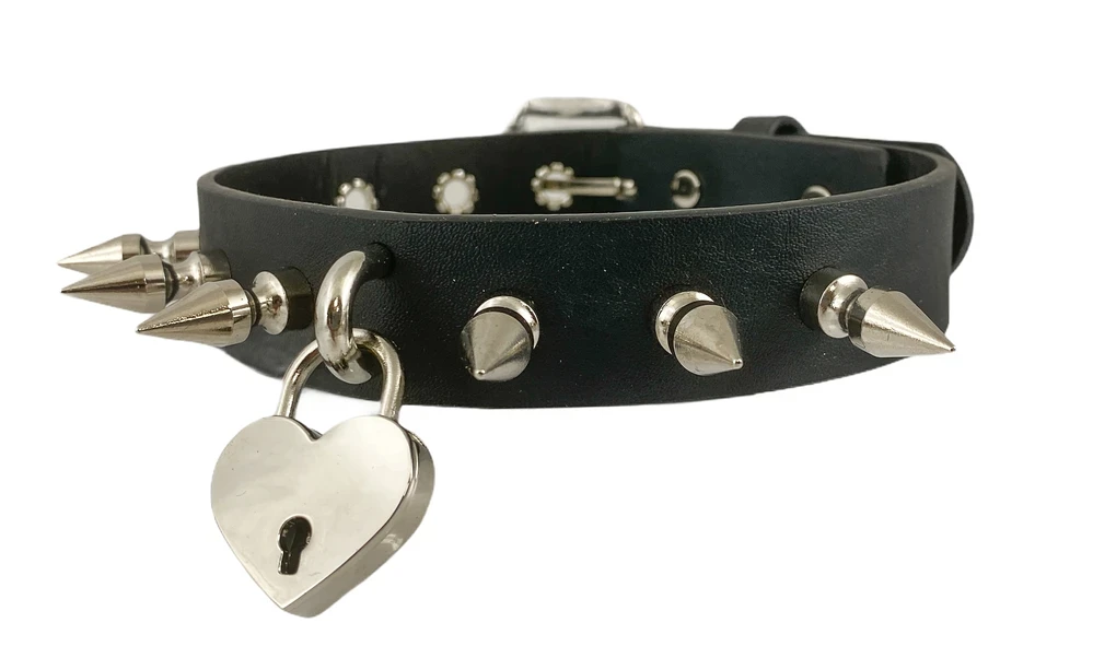 Keep that heart locked up tight with this genuine leather spiked collar choker. It features 1″ spikes, a heart shaped (working!) lock with u-ring, and an adjustable buckle at the back for a perfect fit.