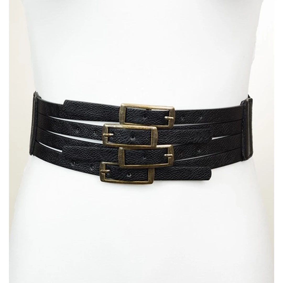 Create some added interest to basic black ensembles with the Ember Multiple Buckle Black Stretch Belt. This elastic belt has two snaps in the back to close and four buckles at the front that are adjustable to fit a variety of sizes.
