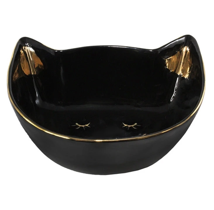 Black ceramic bowl of a cat face outlined in metallic gold. Great container to store your keys, coins or jewelry.
