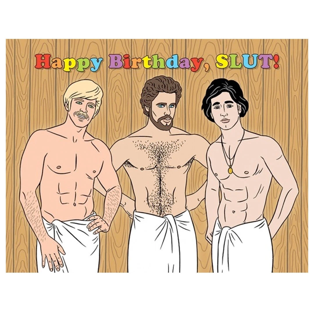 Hopefully you surround yourself with friends that have a great sense of humor! Happy Birthday Slut with 3 shirtless 70’s hunks may just be the winner!