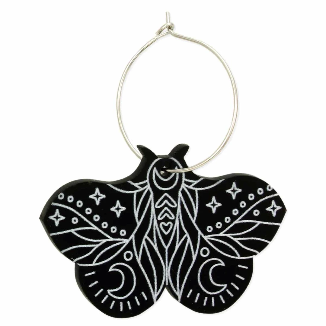 Full of the promise of new beginnings, these symbolic Luna Moth earrings make a stunning addition to any look. A thin silver wire hoop features a large black and white moth drop with a dreamy celestial design. Suitable for wearing with traditional pierced ears and/or stretched lobes alike.