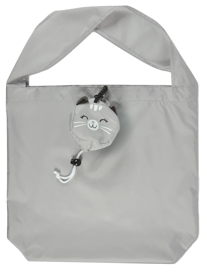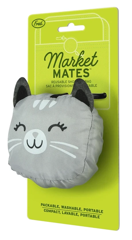 Replace over 100 plastic grocery bags per year with this adorable gray cat reusable shopping bag. This tote is super lightweight and folds into a fun shape that clips to your belt, bike, purse strap so you’ll never forget to grab a bag before you go in! Sturdy construction holds up to 12 pounds or 2 plastic grocery bags worth of stuff!