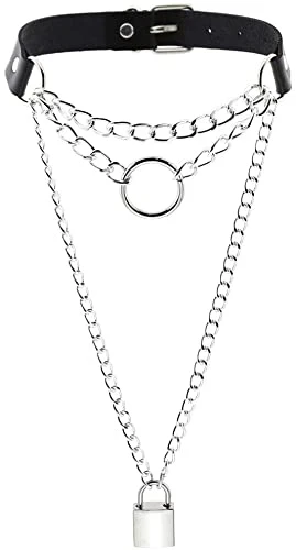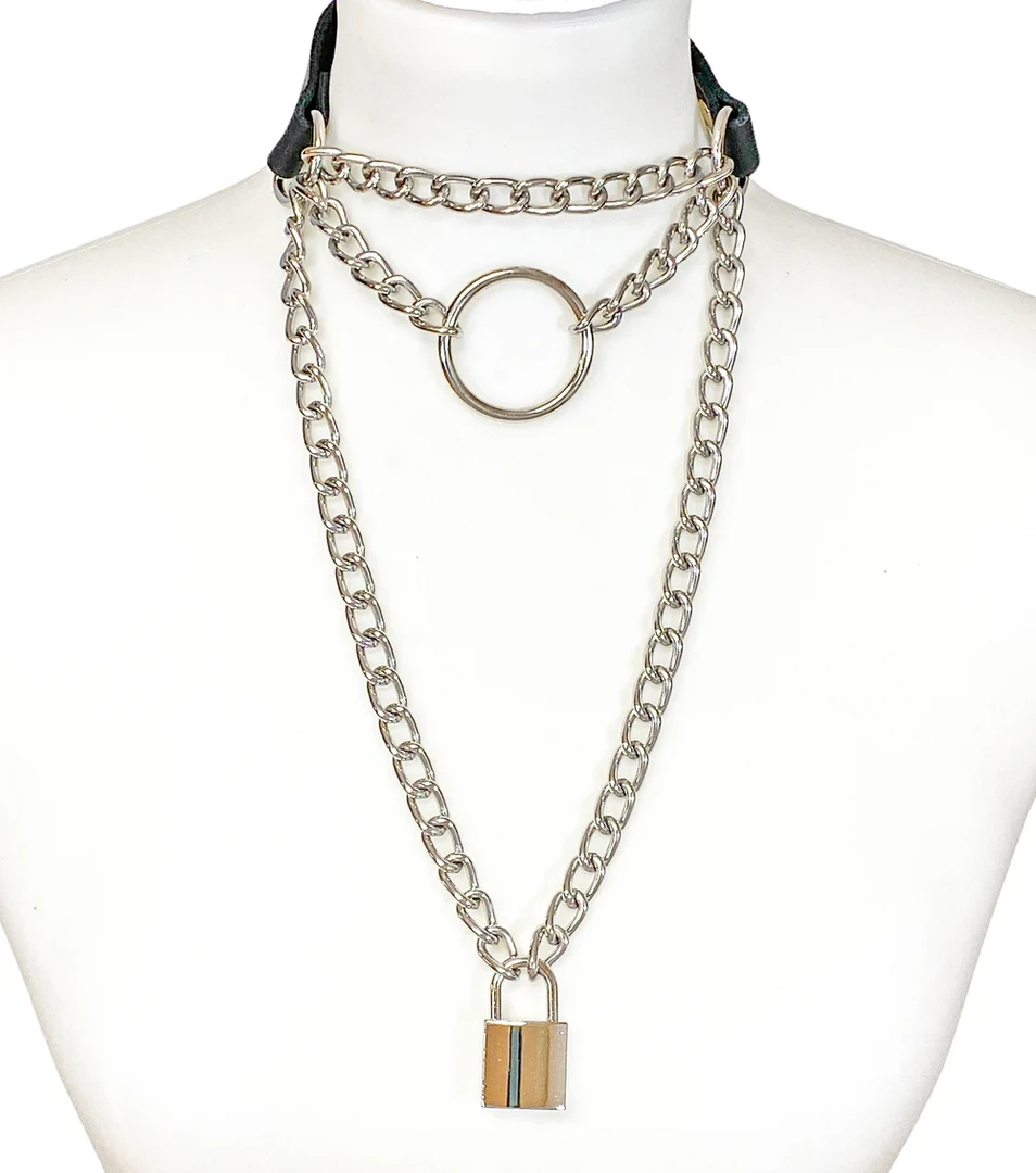 Leather and chains? Yes please! Take that look up a notch or three with this multi-layer Triple Chain Lock Choker. Goes on with a buckle at the back and has a silver lock and large O-ring detail amongst the chains.