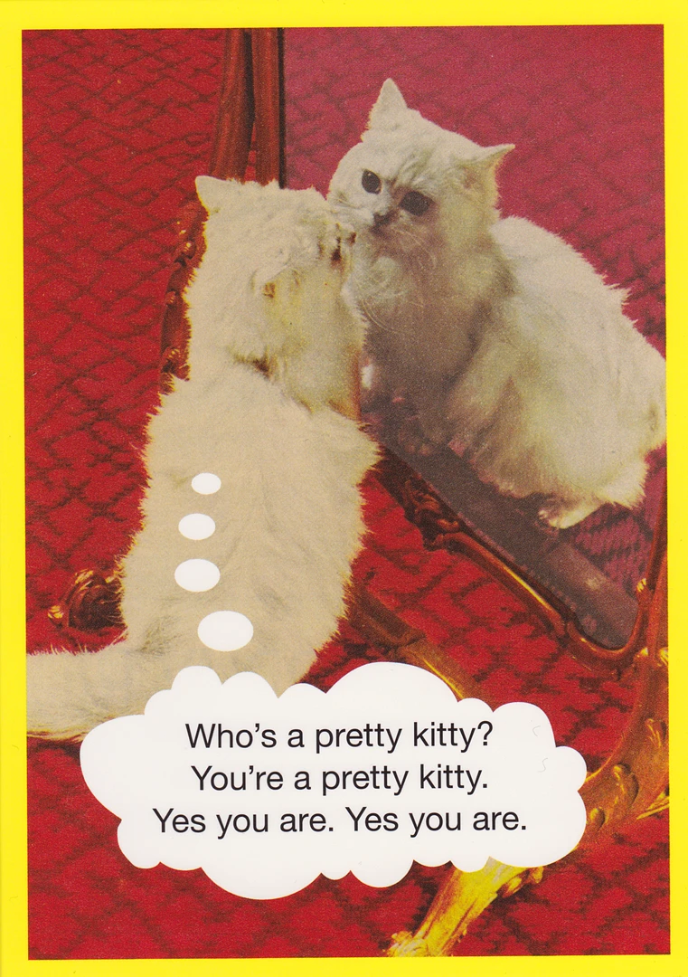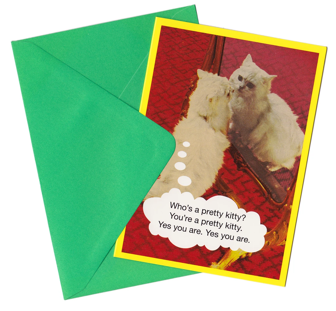 Perfect for pals that may need a little pick-me-up reminder, this Who’s A Pretty Kitty greeting card is blank on the inside and comes with a coordinating green envelope.
