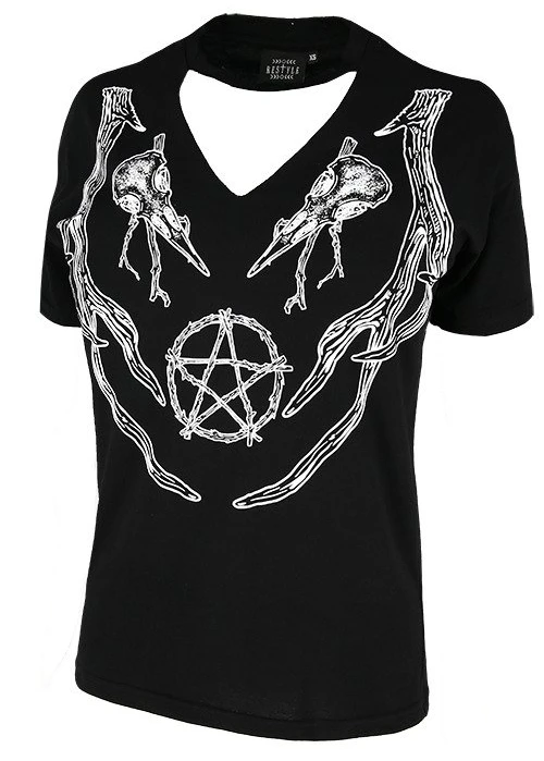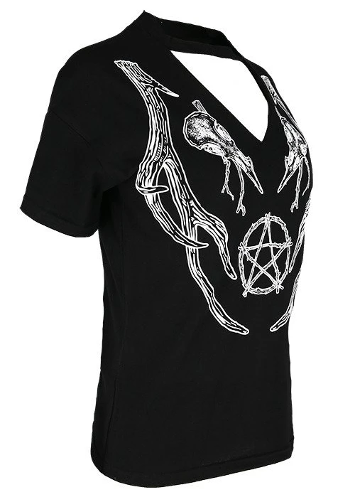 Retreat to nature with this graphic top from Restyle. With a print of deer antlers, crow skull and a pentacle on a soft, black, v neck, choker style top. Slightly fitted style.