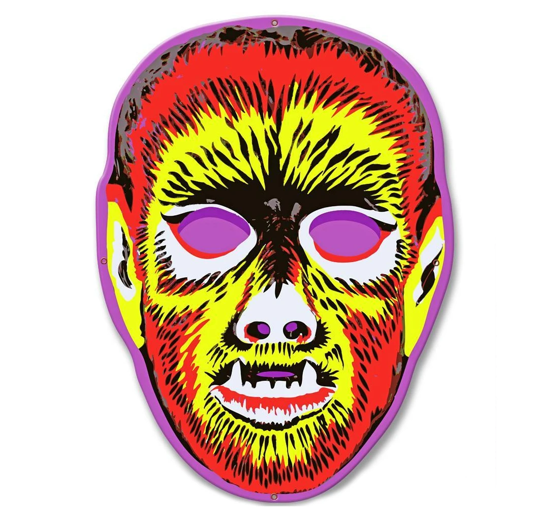Howl with delight and add some retro flair to any room of your choice. This original Retro-a-go-go! artwork is inspired by the fun and sort of creepy oversized Halloween masks that were popular in the 1950’s thru the 1960’s. Colorful and graphic in their own right – perfect for a night of fright! This plasma cut out metal sign is hand made in the USA using heavy gauge american steel and a process known as sublimation, where the image is baked into a powder coating for a durable and long lasting finish. The smaller size makes them a perfect fit for any home!