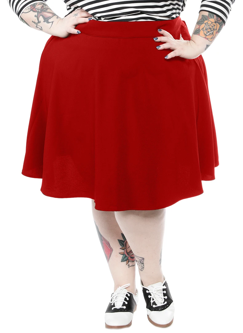 The ultimate fun and flirty skirt from Retrolicious has arrived! Made of a classic red rayon, this vintage style skater skirt features an elasticized back waist for ease of wear and a back zippered closure. Pair with any top or sweater for an instant easy and cute outfit!