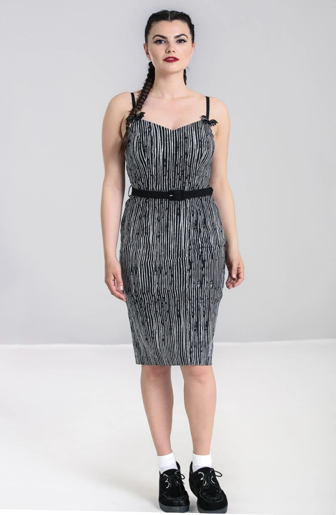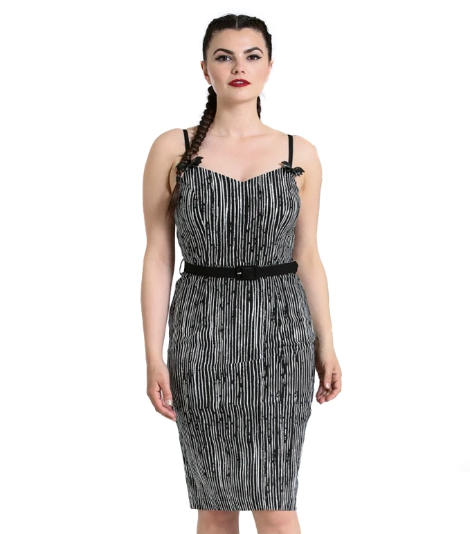 Sally probably changes her wardrobe up once in awhile, right?! We think she’d absolute fall for this Jack-esque dress from Hell Bunny! The Regan Pencil Dress is crafted from a black bengaline with scratched stripe print in white. The adjustable black straps are finished with sweet faux leather bat bow details with brooch backing, so they can be removed if you wish. The fitted bodice has a flattering sweetheart neckline while the matching black belt cinches in your waist. Zips up center back for fastening.