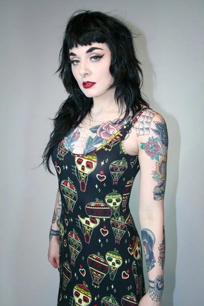 We might not be able to travel right now, but we can pretend in the new Bon Voyage Maxi Dress! This soft and slinky dress features an amazing macabre hot air balloon print in beautiful shades of green, red and cream. It is comprised of a soft, stretchy and lightweight rayon jersey that is an absolute dream to wear!