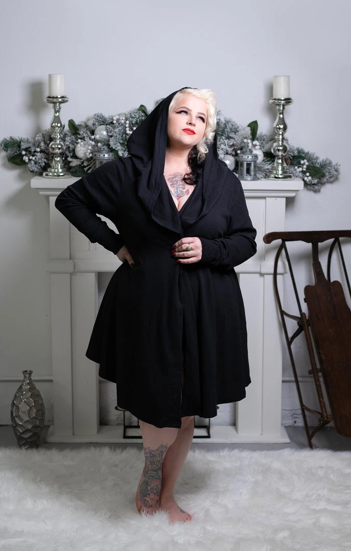 The new Black Hooded Cardigan is the perfect blend of function and drama! This cotton knit cardigan is drapey, soft and stretchy, and it has a HUGE oversized hood. It’s the best topper for literally any outfit… and it has pockets! Fit note: If you prefer a snugger style, we recommend sizing down from your normal Sourpuss size!