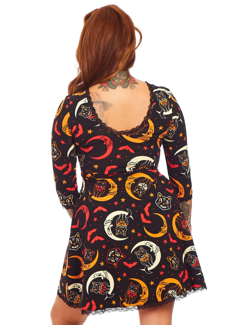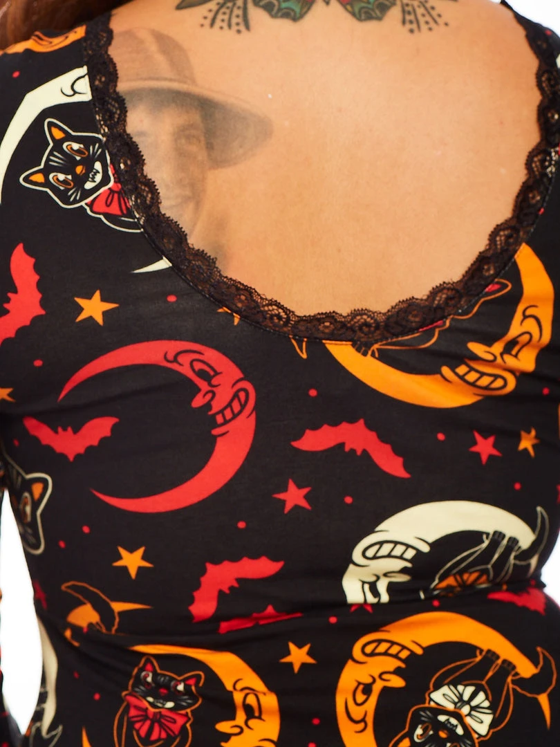 The puns are a-plenty when describing this dress, but we think the name of the Over the Moon Low-Back dress really expresses how we feel about it! This fun, festive cotton knit dress features our Over the Moon print with cats, bats, moons and more! It has a scoop neck in the front and back, and is trimmed with a super soft lace. It’s comfy, stretchy, AND it has pockets!