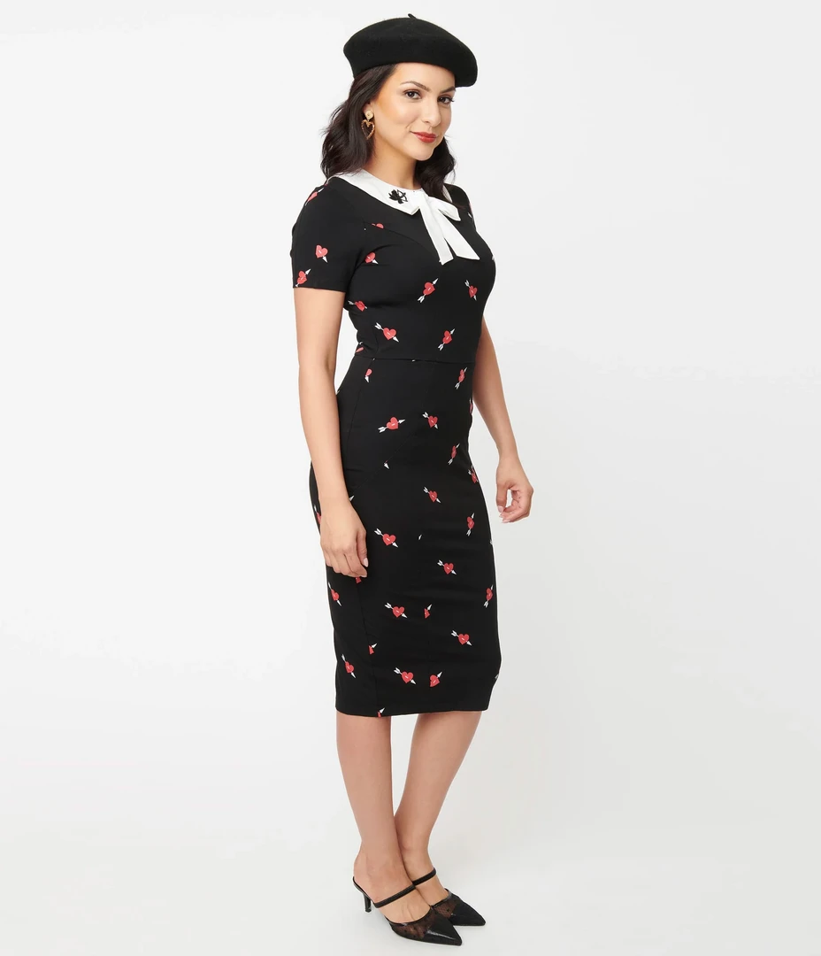 Get yourself caught in Cupid’s bow in the Renata Dress from Unique Vintage! A truly stunning silhouette in black stretch knit, it has an all over print of red hearts with piercing arrows throughout. Designed with a princess seamed and paneled form to hug your curves, a dramatic white Peter Pan collar tops the modest neckline and is embellished with a cupid and heart embroidery, centered by a darling bow tie while sweet short sleeves keep you comfortable. Outfitted with a back zipper and back vent for sultry struts.