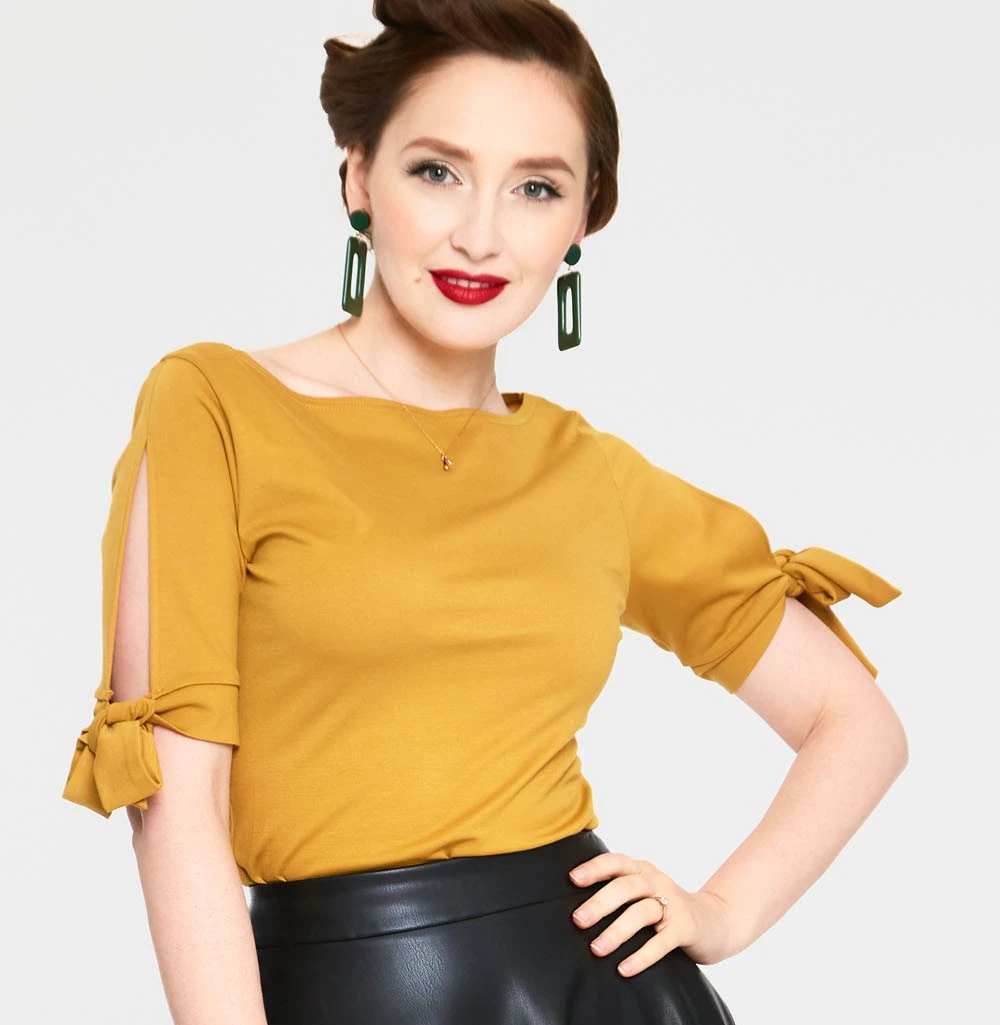 Slip into the Benny Boat Neck Tie Sleeve Top and instantly add vintage glamour to any outfit! This stunner of a top is crafted from a soft knit mustard fabric and has open elbow length sleeves that tie together at the cuff in a bow. Looks great with skirts and jeans alike!