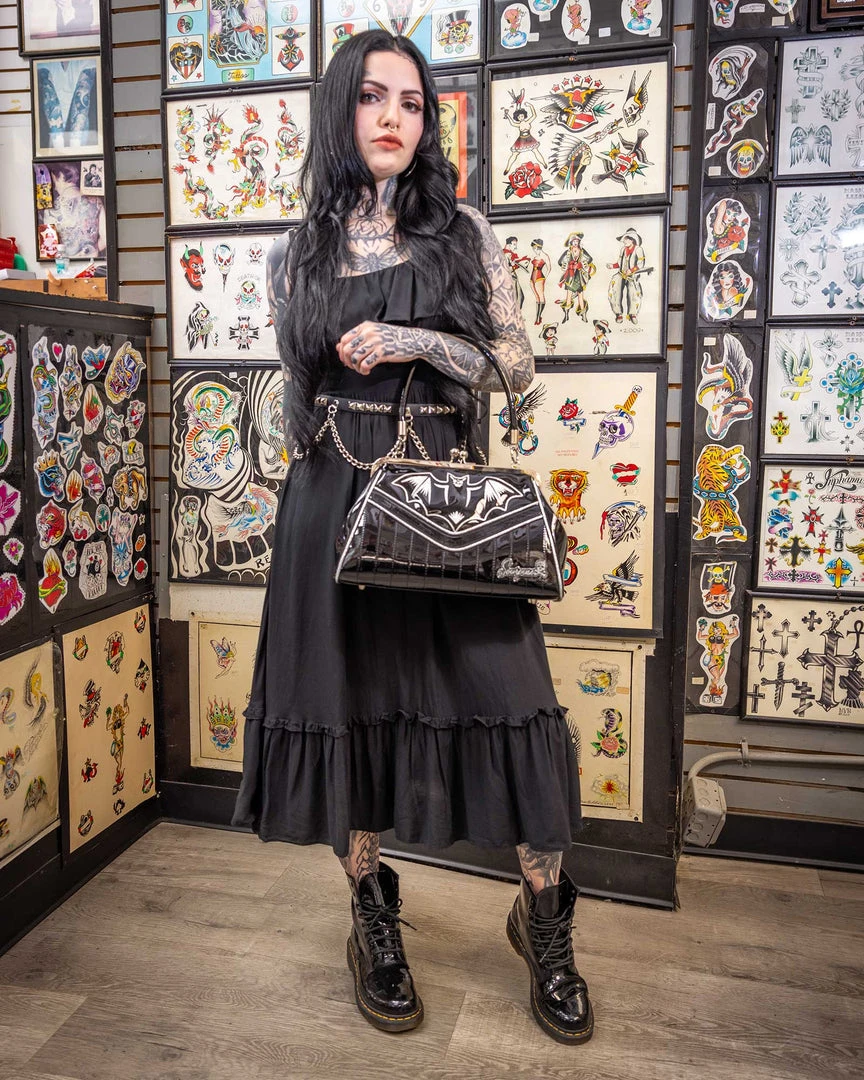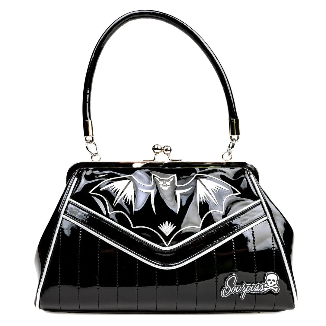 Worthy of any vamp’s wardrobe, our Nokturnal Bat Kisslock Purse in silver is a surefire knockout. Crafted from a high gloss black vinyl with silver glitter vinyl accents, this purse is full of all the vintage inspired details you love; a kisslock closure, tuck and roll style stitching and piping. The highlight is our killer Nokturnal Bat artwork front and center, in silver. The inside is fully lined with multiple pockets to keep you organized and that lipstick within reach!
