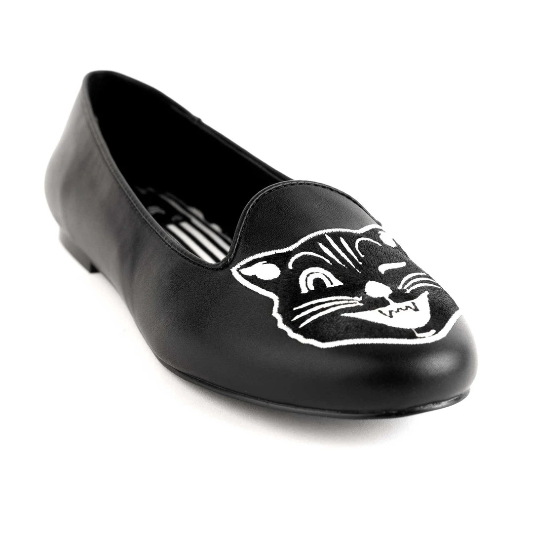Jinx is sure to follow you everywhere you go when you slip on these limited edition Strangecvlt x Sourpuss Jinx the Cat Flats! Crafted from a quality black vegan leather, they feature our signature Jinx the Cat face embroidered in black and white on each toe. 100% vegan with a rubber outsole.